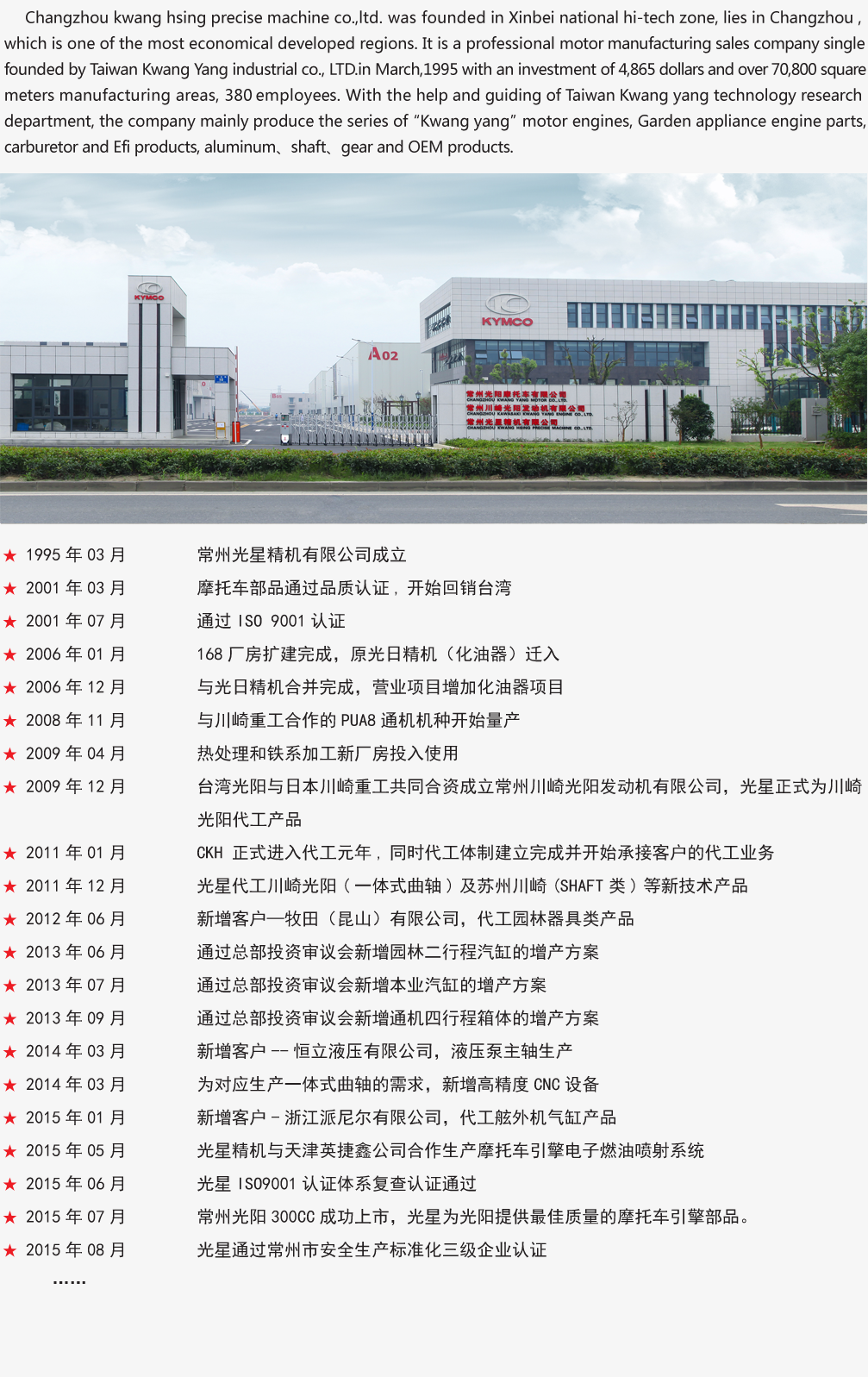常州光星精機有限公司,地處長三角經(jīng)濟最發(fā)達(dá)地區(qū)之一的常州市,公司建于新北國家高新區(qū)內(nèi),由臺灣光陽工業(yè)股份有限公司1995年3月獨資設(shè)立的專業(yè)發(fā)動機制造銷售公司,投資總額4865萬美元,占地總面積7.08萬平方米,現(xiàn)有員工380人。依托臺灣光陽技研部與生產(chǎn)中心的支援與指導(dǎo),公司主要生產(chǎn)“光陽”摩托車系列發(fā)動機,園林器具發(fā)動機零部件,化油器及電噴產(chǎn)品,鋁、軸、齒輪類代工產(chǎn)品。